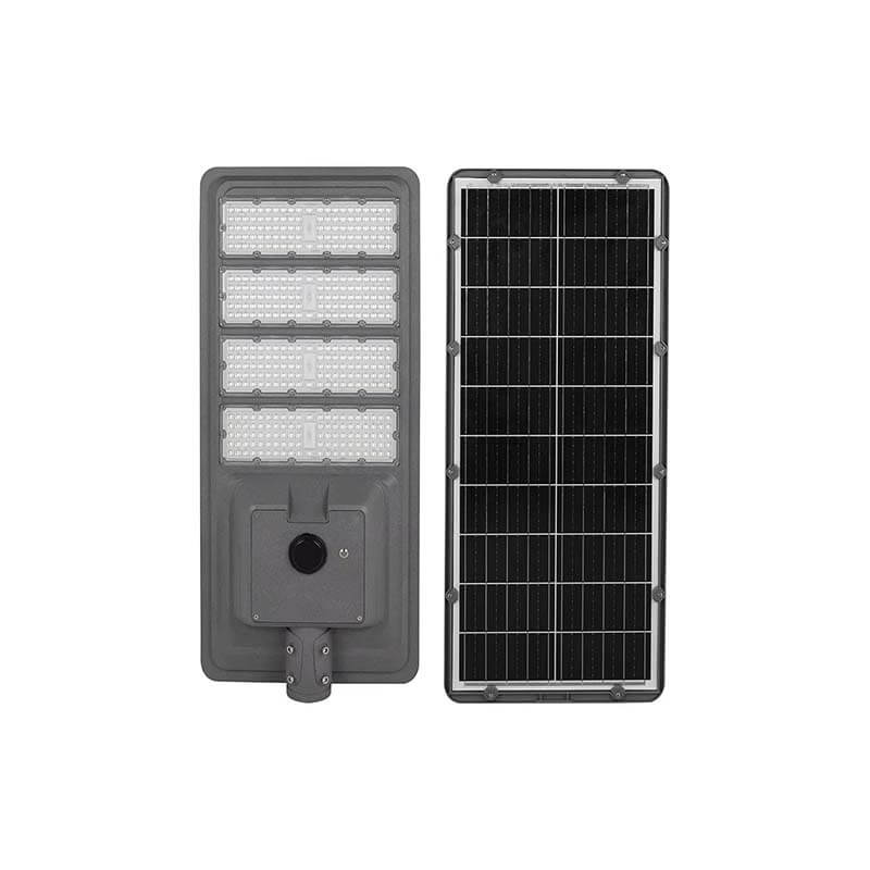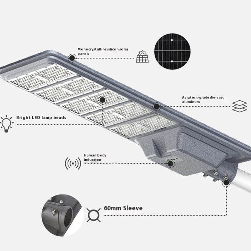 All-in-one solar street light contains LED, battery, solar panel, and controller all in the lamp body, then you can install the lamp directly, no need for a cable. It can work in PIR motion sensor, time control, center control way.