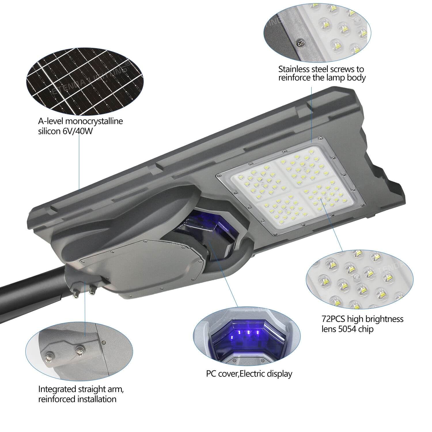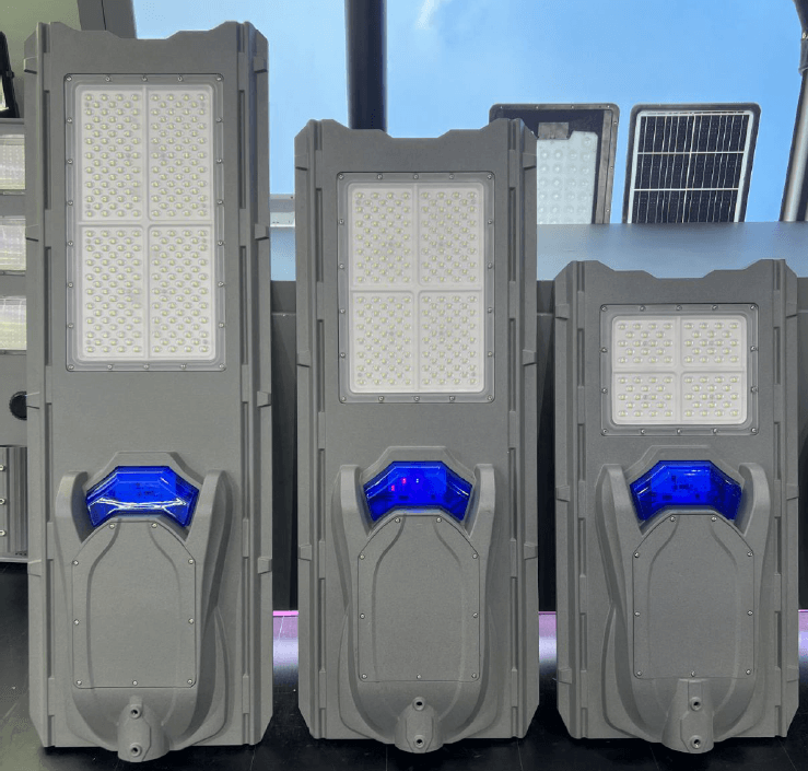 All-in-one solar street light contains LED, battery, solar panel, and controller all in the lamp body, then you can install the lamp directly, no need for a cable. It can work in PIR motion sensor, time control, center control way.